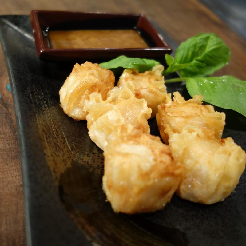 Octopus fritters topped with kewpie mayo, okonomiyaki sauce, bonito flakes, shredded seaweed.
